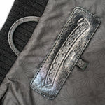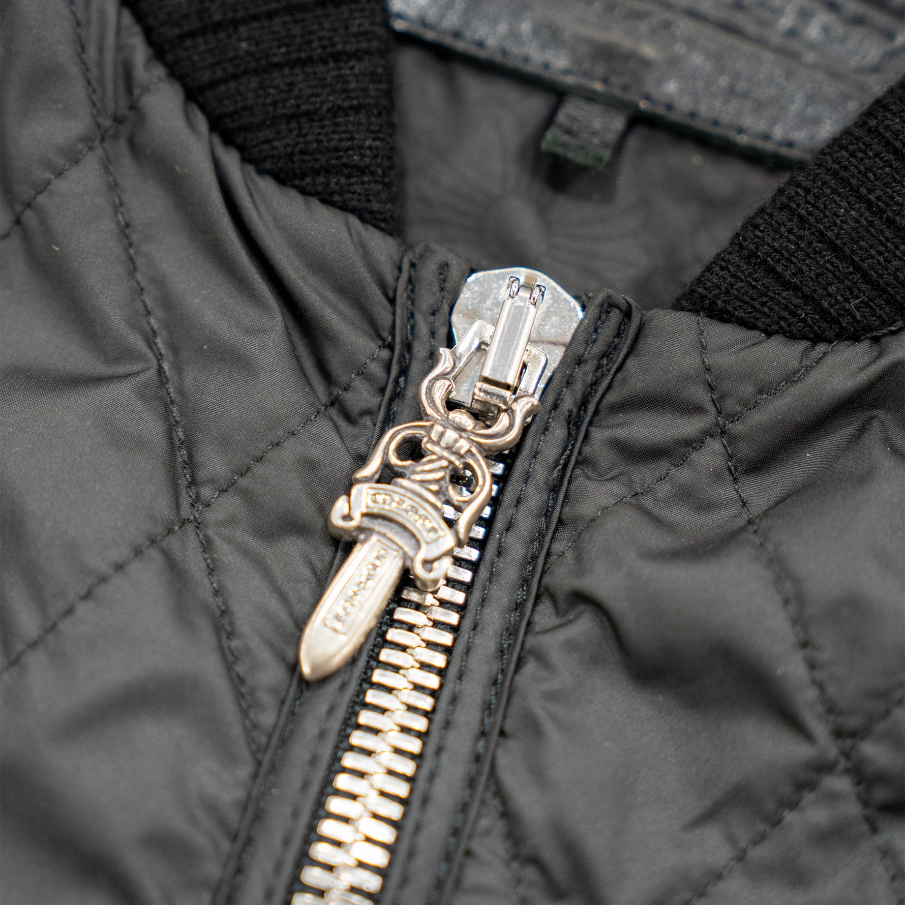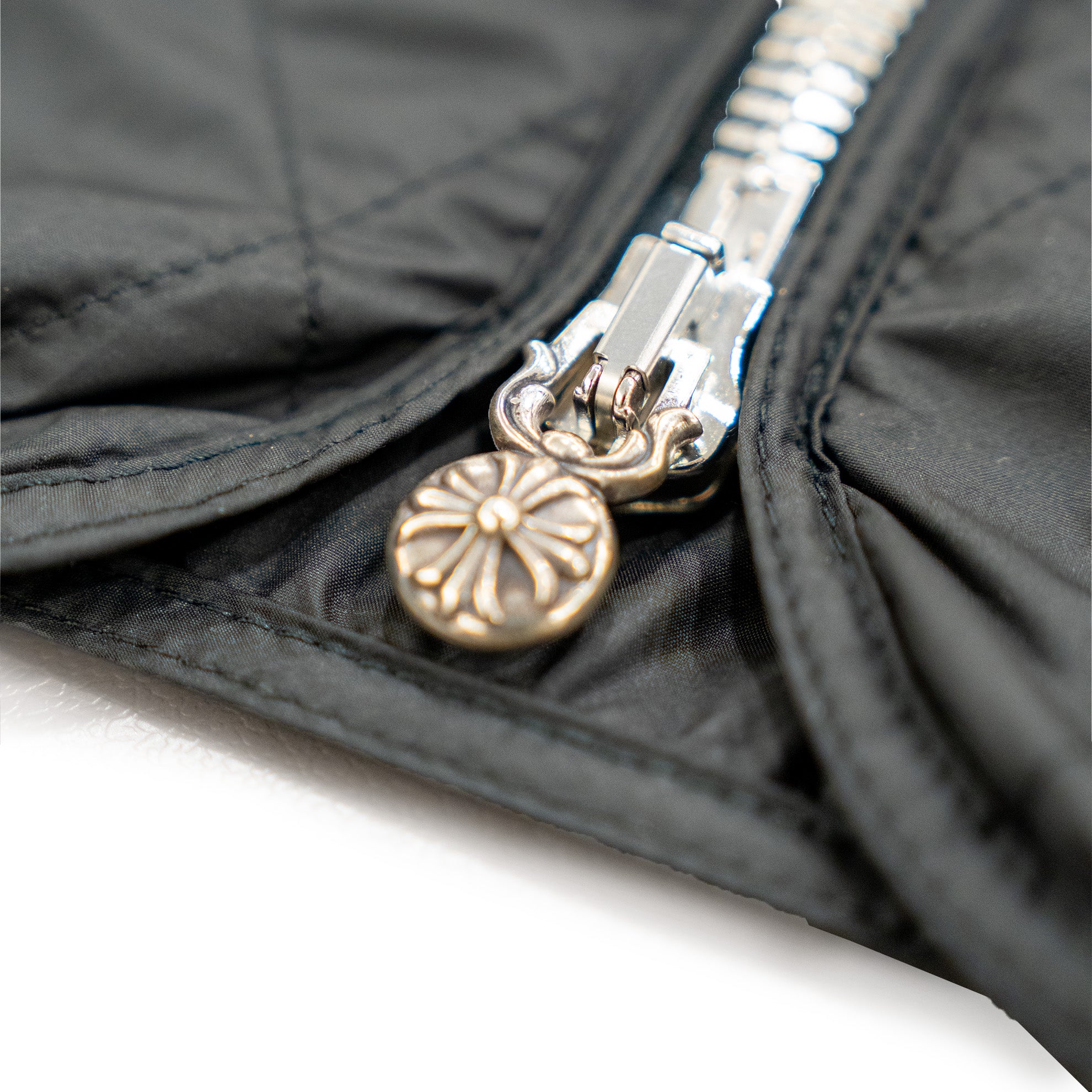 This iconic Chrome Hearts "Papa" vest is crafted from black diamond-quilted polyester, offering a timeless aesthetic with exceptional attention to detail. It features solid sterling silver hardware throughout, including the signature dagger and crossball zippers at the front, complemented by an ornate CH plaque in the back. The spine is adorned with a striking vertical arrangement of seven lamb leather cross patches.