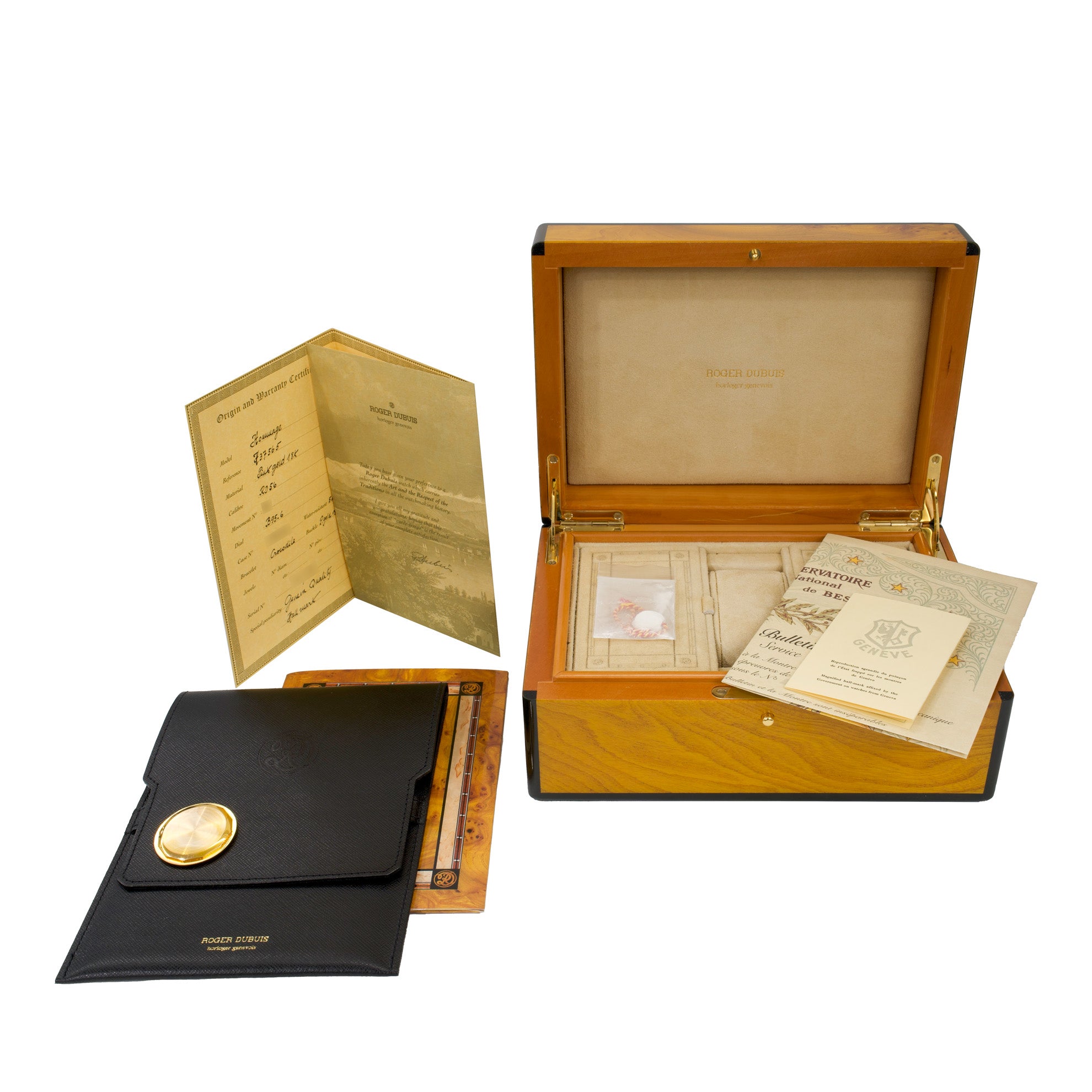 Accompanying Materials: Roger Dubuis Origin and Warranty Certificate, the Office for the Optional Control of Watches of Geneva Certificate, Besançon National Observatory Chronometric Rating Certificate, leather folio, additional solid caseback, hang tag and presentation box