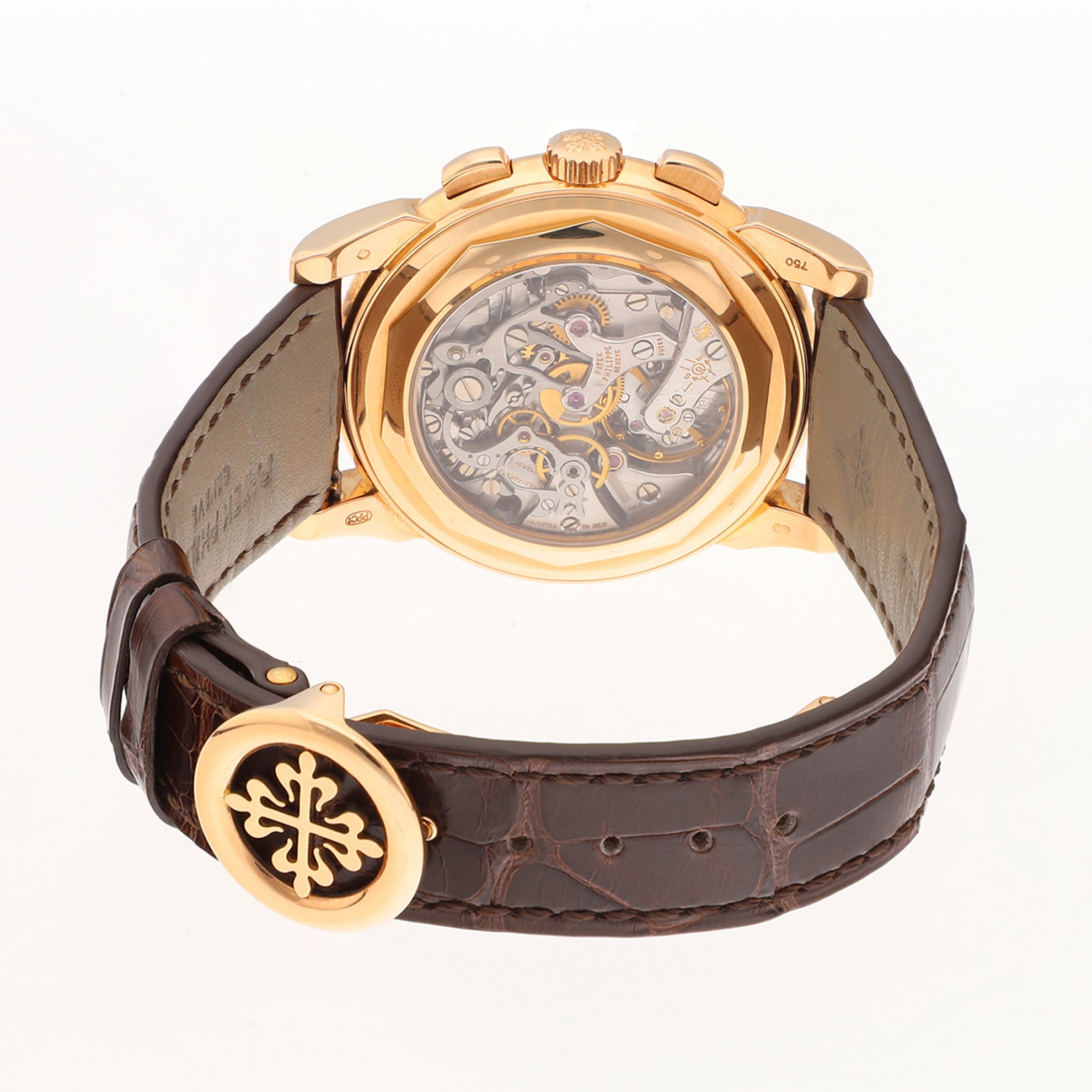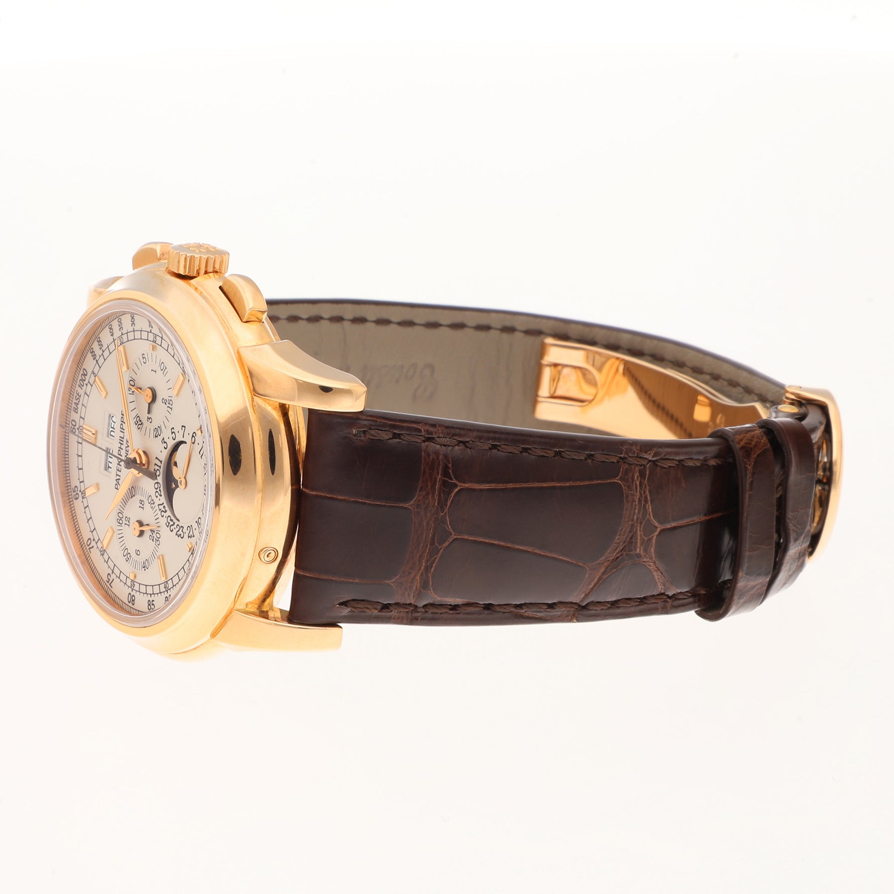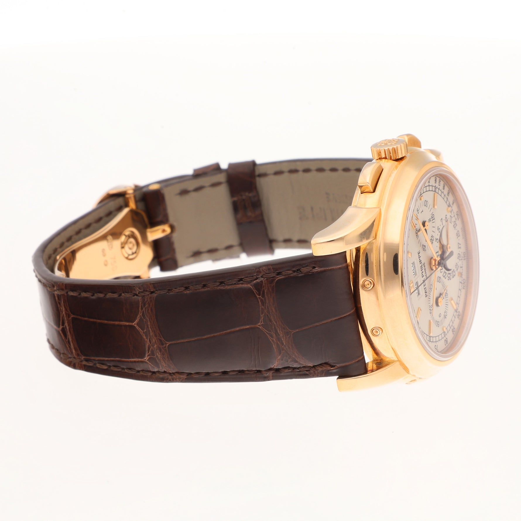 Strap Bracelet: Brown leather strap with 18K rose gold Patek Philippe deployant clasp