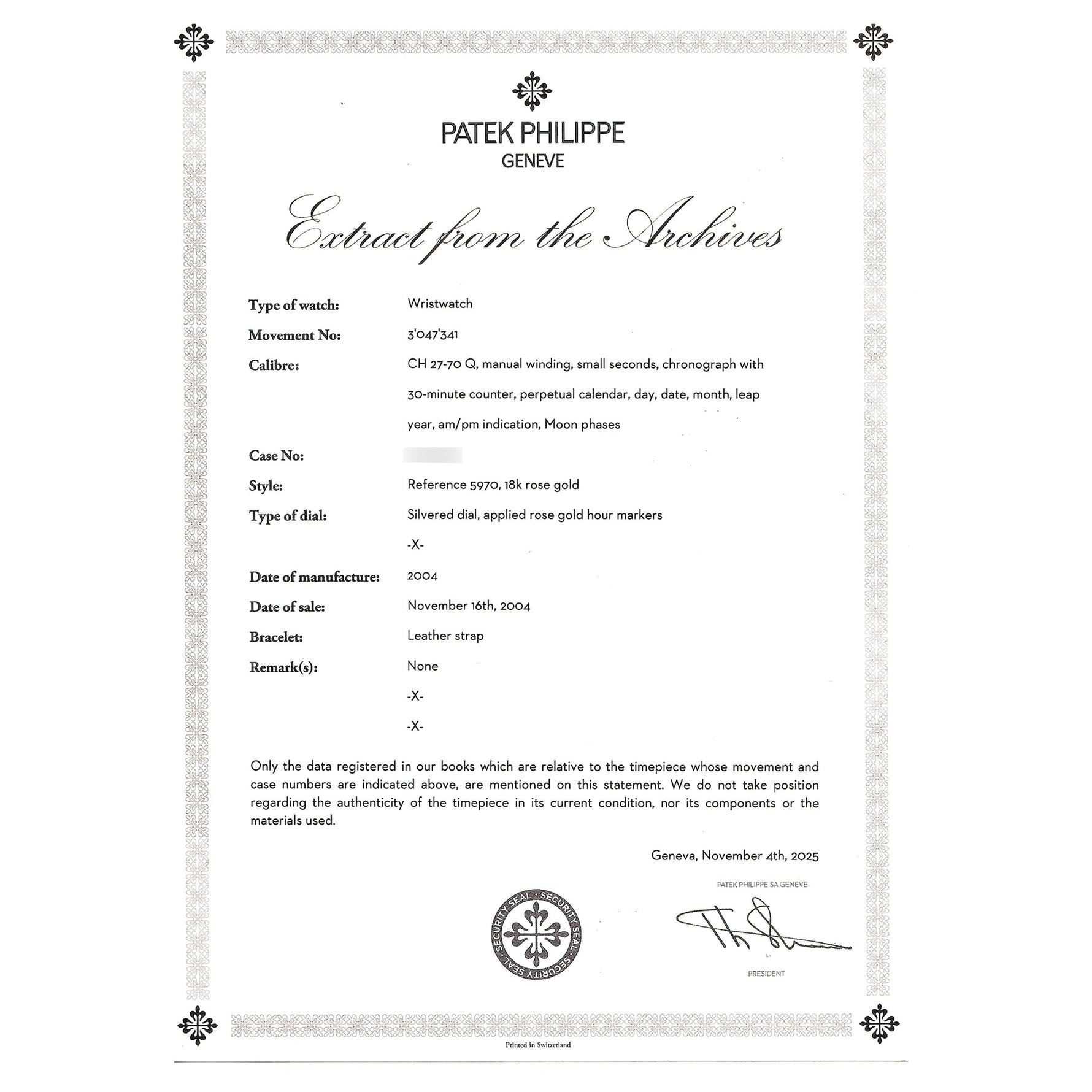 Accompanying Materials: Patek Philippe Extract from the Archives