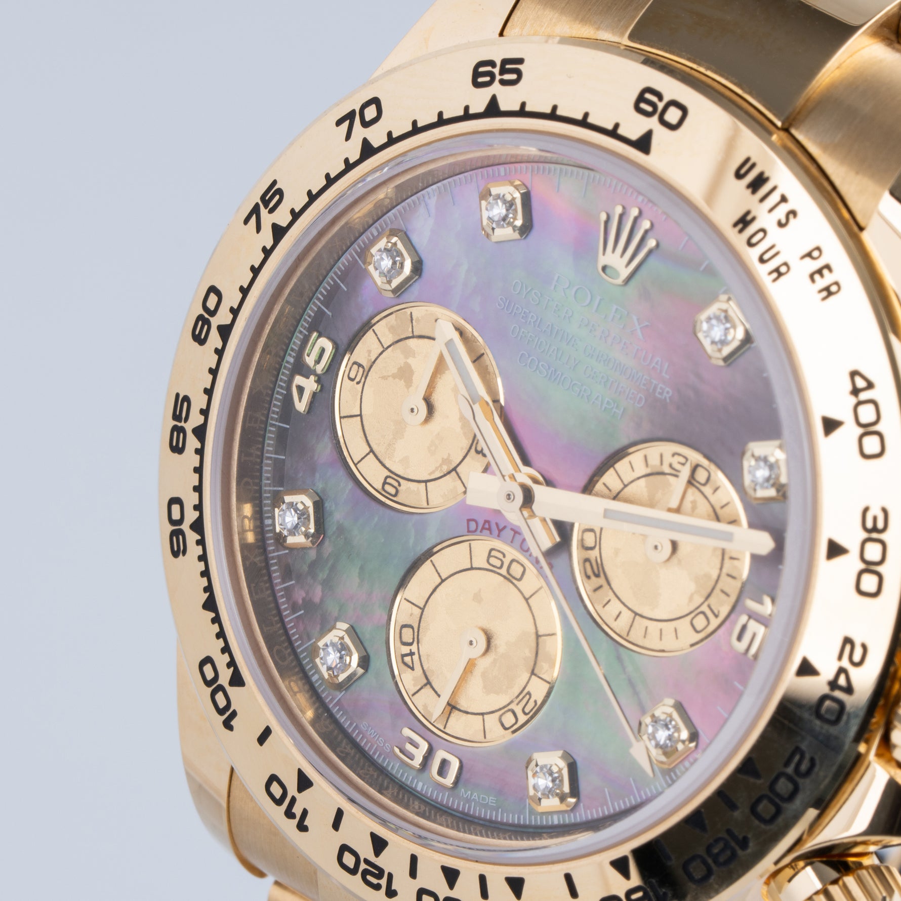 Features: Black Mother-of-pearl dial, 8 diamond-set indexes